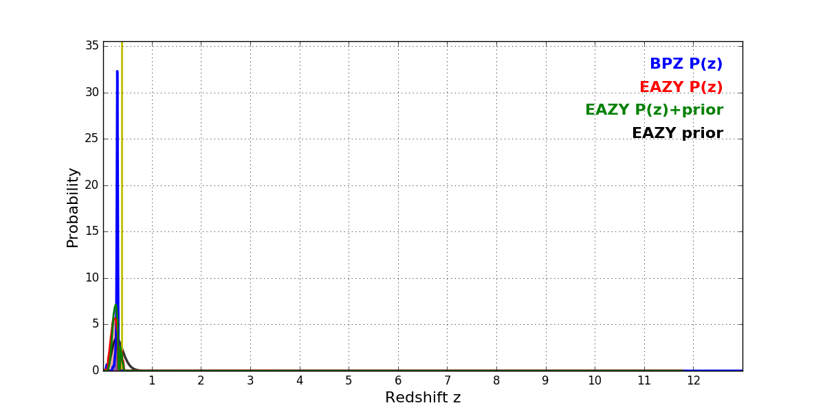 In P(z) plots: Yellow lines mark the cluster redshift z = 0.390,