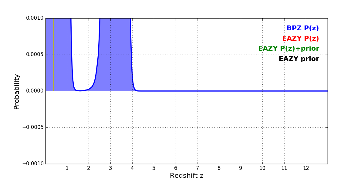 In P(z) plots: Yellow lines mark the cluster redshift z = 0.390,