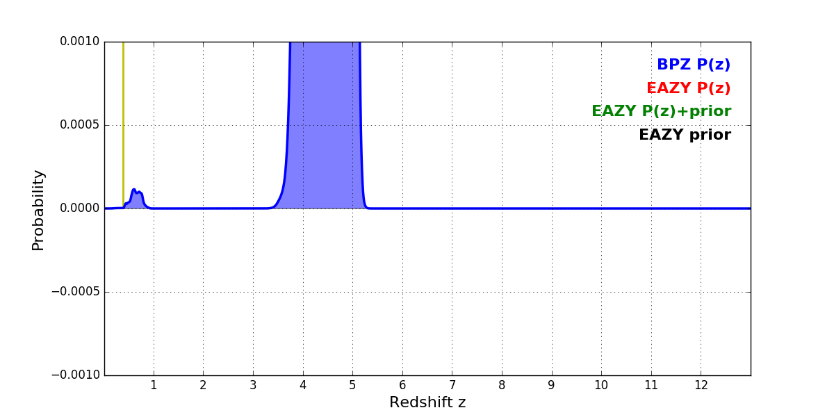 In P(z) plots: Yellow lines mark the cluster redshift z = 0.390,