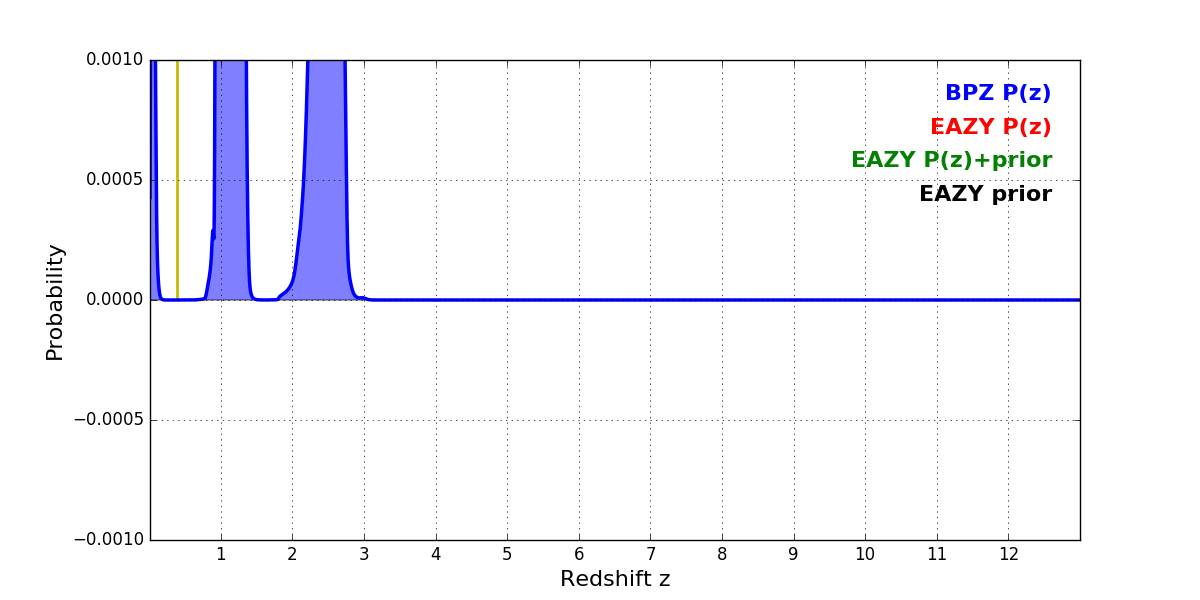 In P(z) plots: Yellow lines mark the cluster redshift z = 0.390,