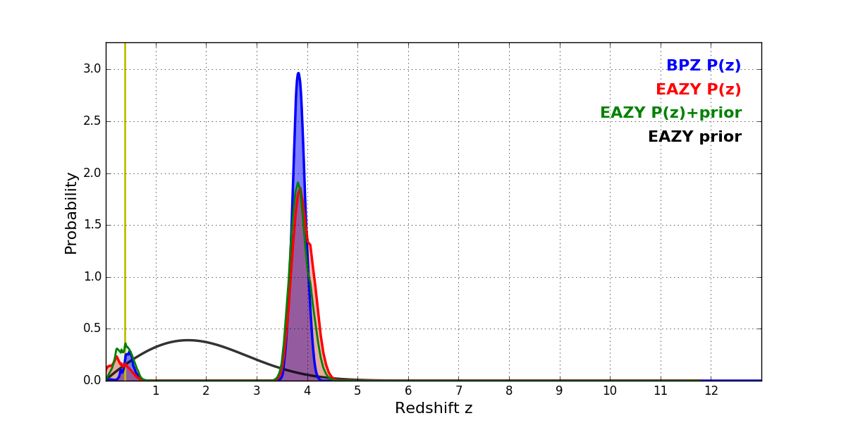 In P(z) plots: Yellow lines mark the cluster redshift z = 0.390,