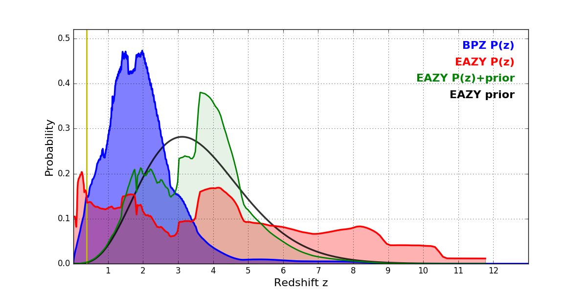 In P(z) plots: Yellow lines mark the cluster redshift z = 0.390,