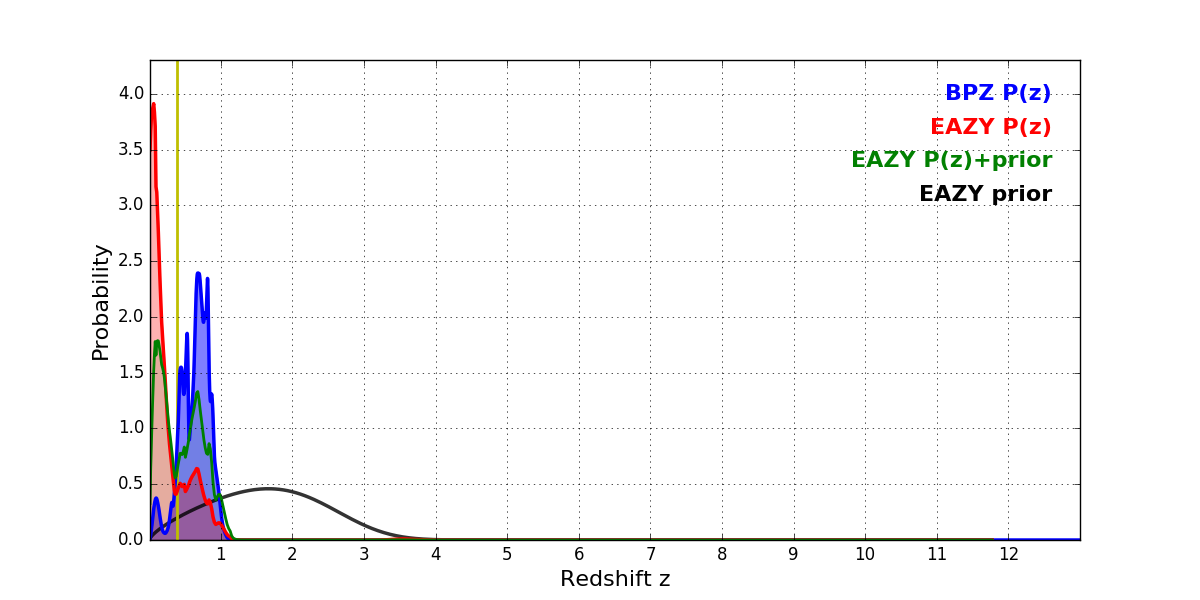 In P(z) plots: Yellow lines mark the cluster redshift z = 0.390,