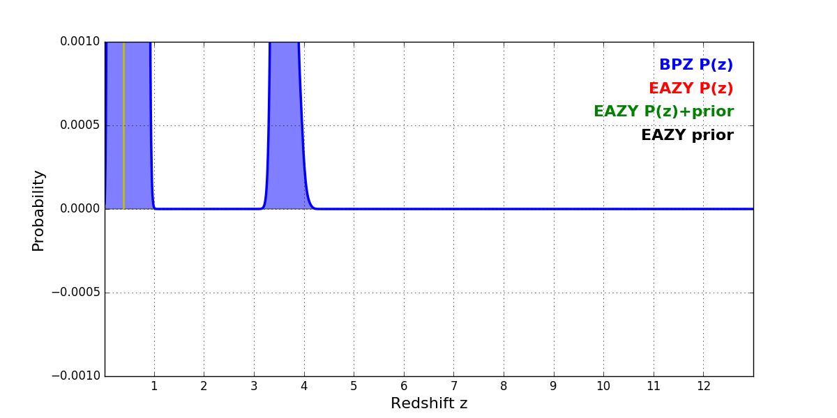 In P(z) plots: Yellow lines mark the cluster redshift z = 0.390,