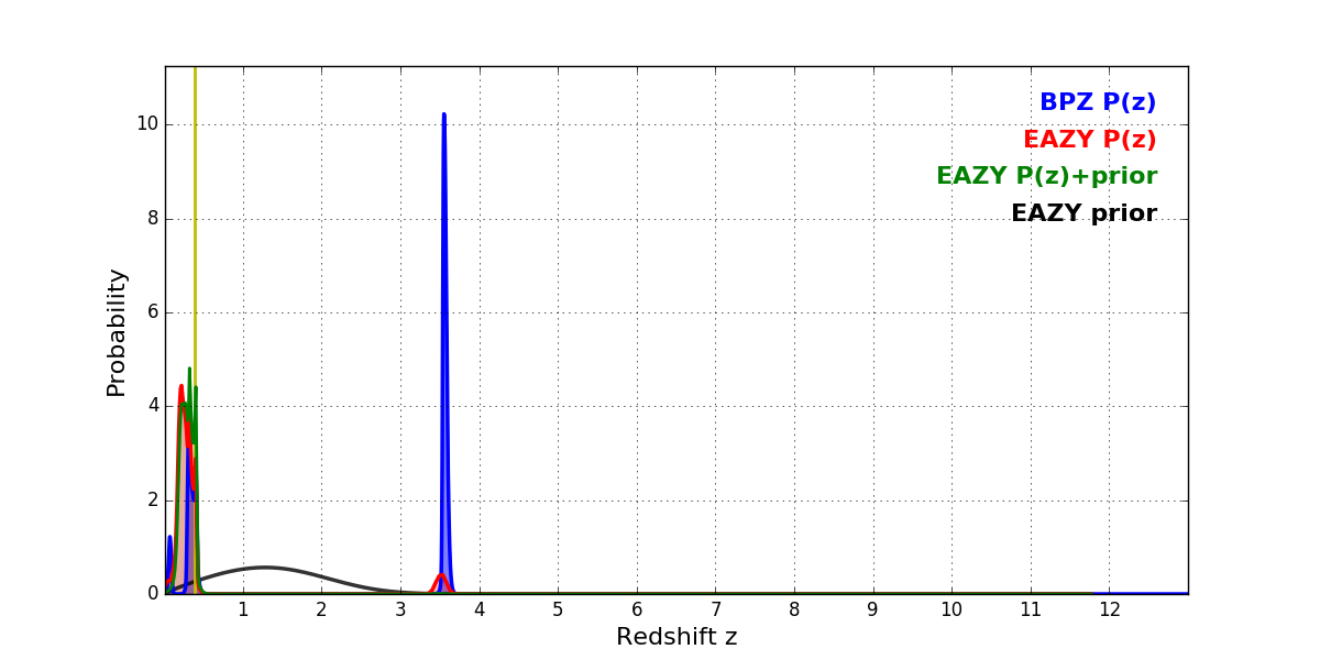 In P(z) plots: Yellow lines mark the cluster redshift z = 0.390,