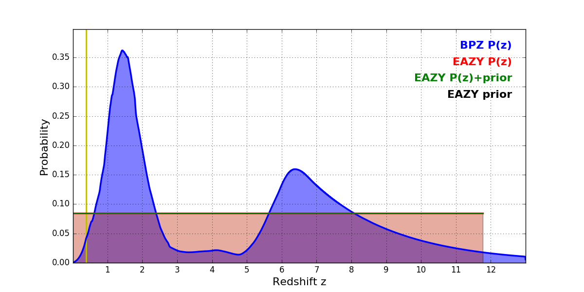 In P(z) plots: Yellow lines mark the cluster redshift z = 0.390,