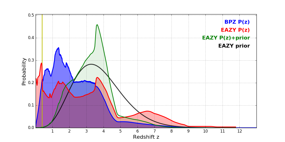 In P(z) plots: Yellow lines mark the cluster redshift z = 0.390,