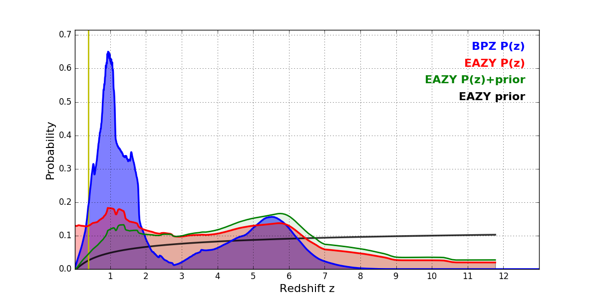 In P(z) plots: Yellow lines mark the cluster redshift z = 0.390,