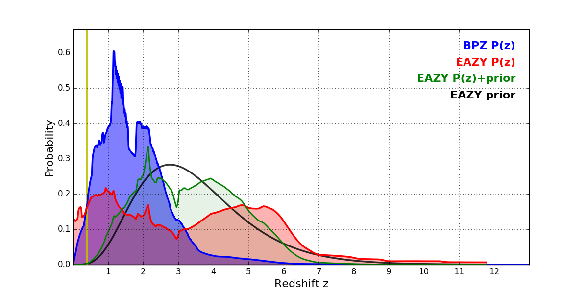 In P(z) plots: Yellow lines mark the cluster redshift z = 0.390,