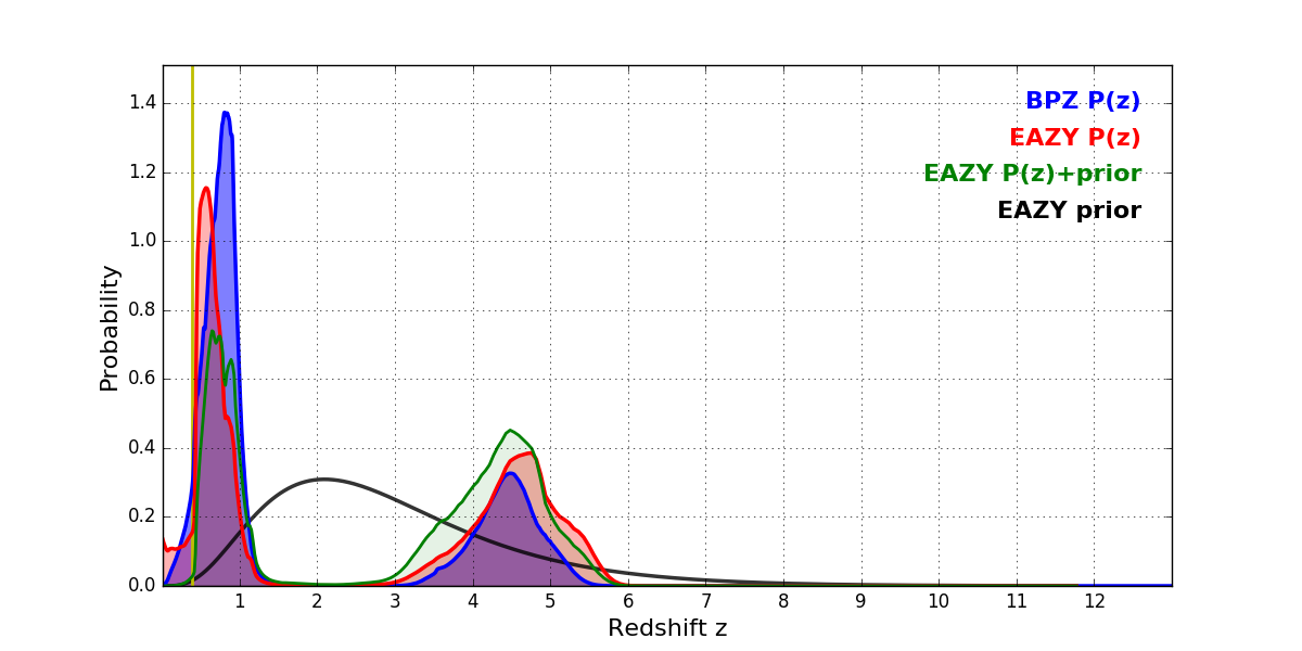 In P(z) plots: Yellow lines mark the cluster redshift z = 0.390,