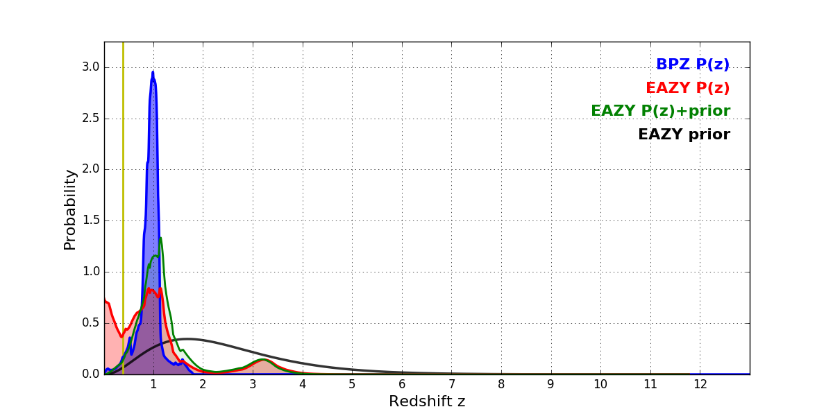 In P(z) plots: Yellow lines mark the cluster redshift z = 0.390,