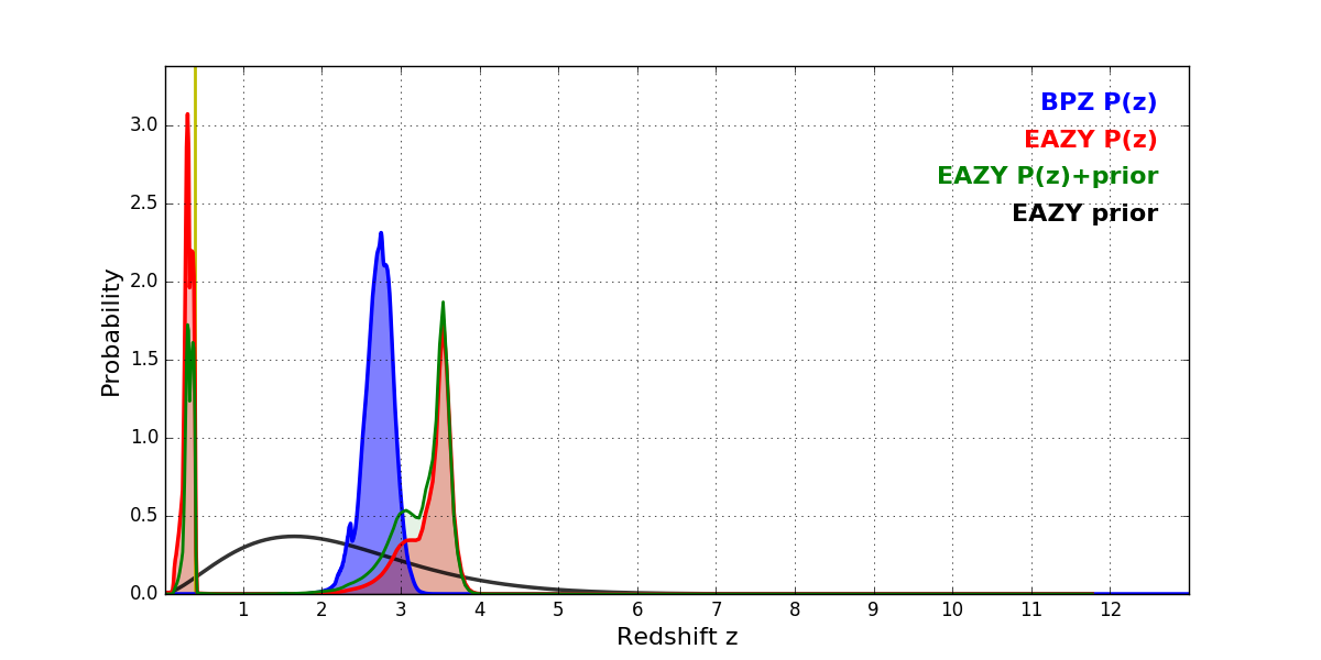 In P(z) plots: Yellow lines mark the cluster redshift z = 0.390,
