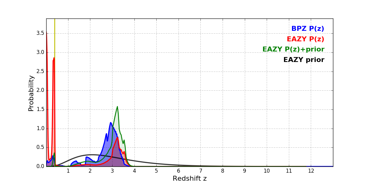 In P(z) plots: Yellow lines mark the cluster redshift z = 0.390,