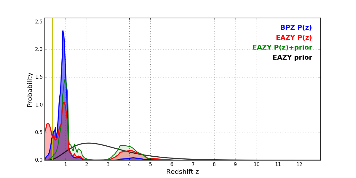 In P(z) plots: Yellow lines mark the cluster redshift z = 0.390,