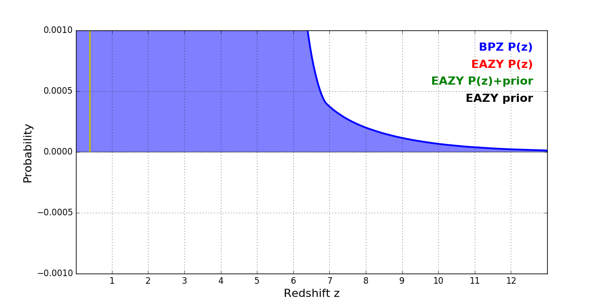 In P(z) plots: Yellow lines mark the cluster redshift z = 0.390,