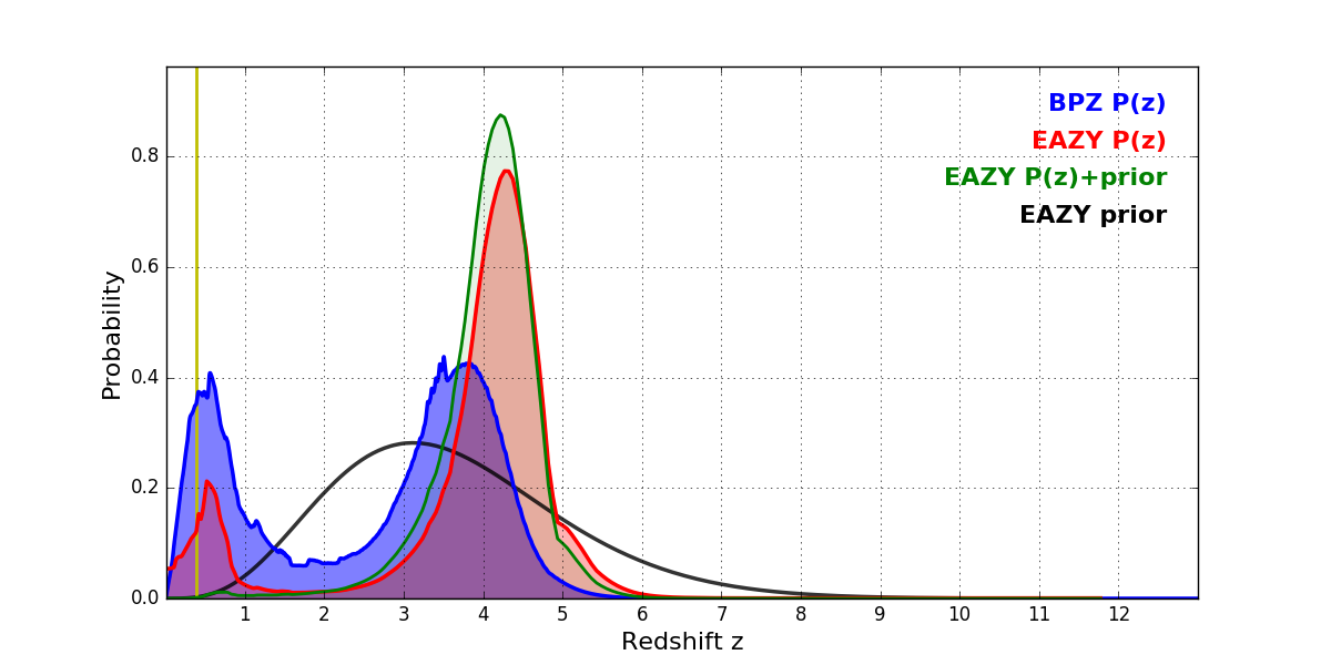 In P(z) plots: Yellow lines mark the cluster redshift z = 0.390,