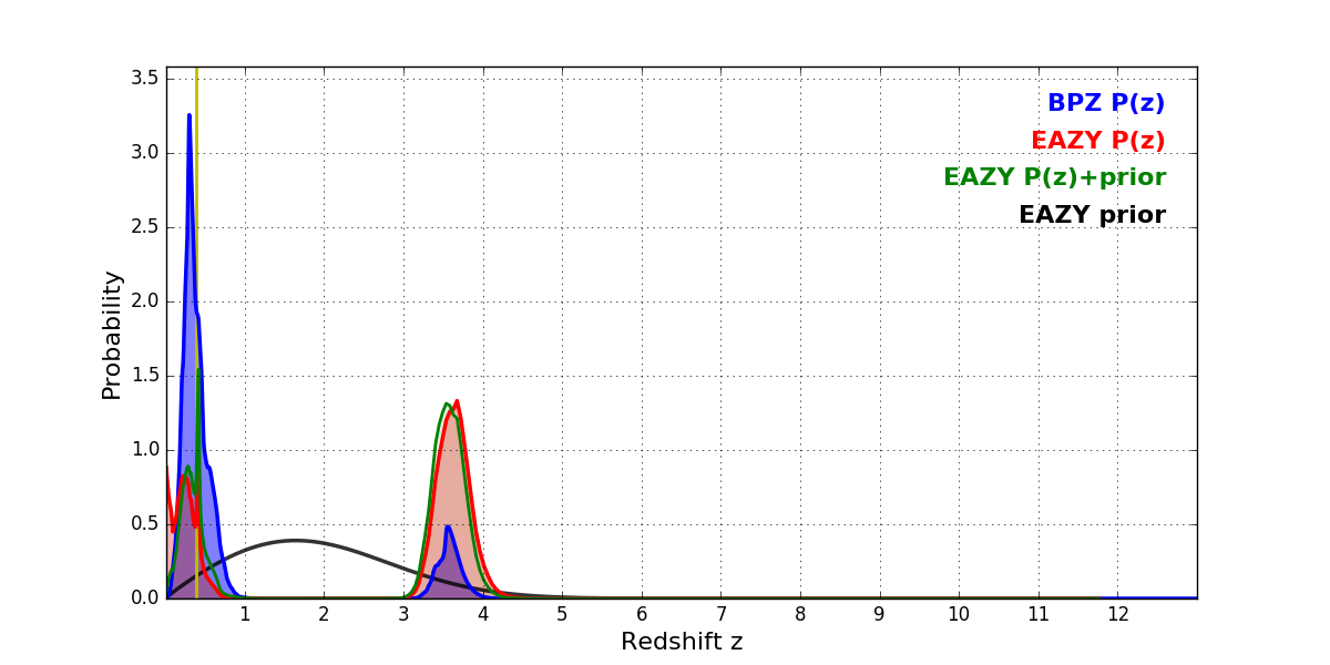 In P(z) plots: Yellow lines mark the cluster redshift z = 0.390,