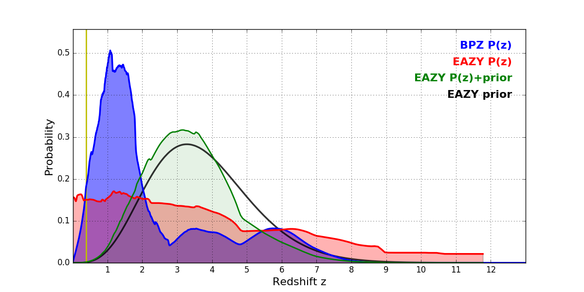 In P(z) plots: Yellow lines mark the cluster redshift z = 0.390,