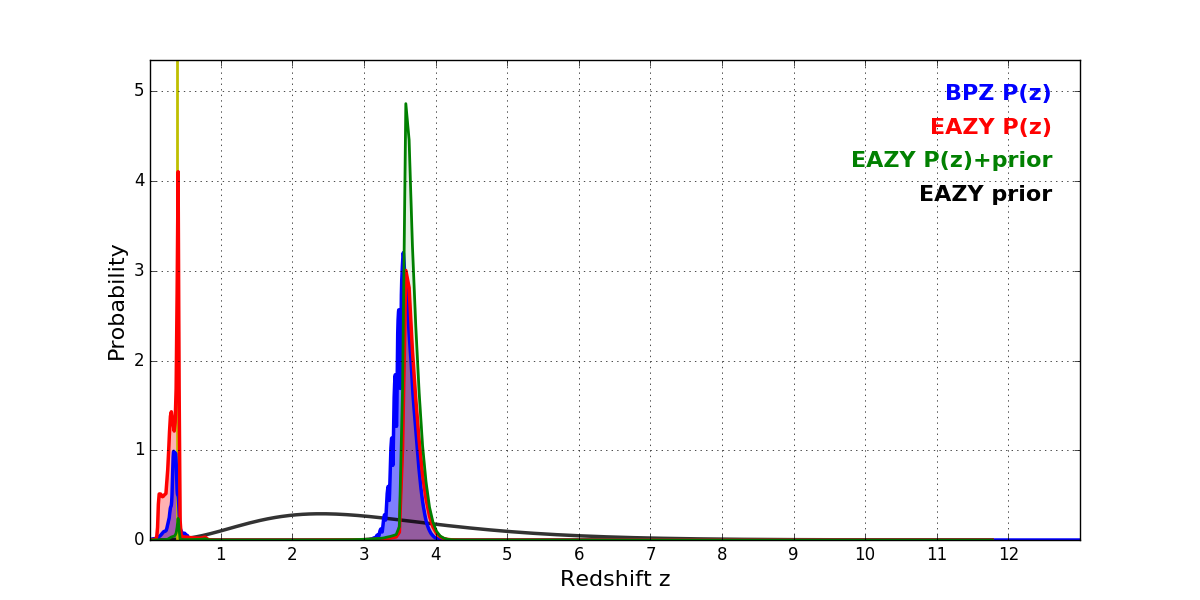 In P(z) plots: Yellow lines mark the cluster redshift z = 0.390,