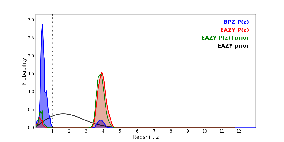 In P(z) plots: Yellow lines mark the cluster redshift z = 0.390,