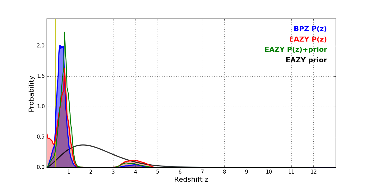 In P(z) plots: Yellow lines mark the cluster redshift z = 0.390,