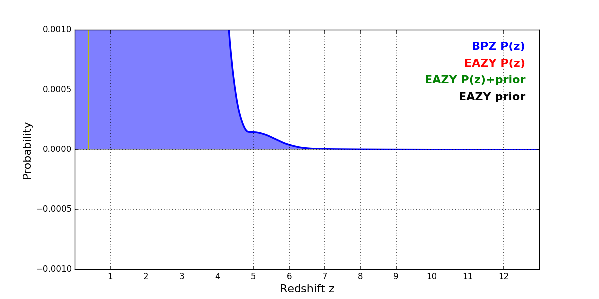 In P(z) plots: Yellow lines mark the cluster redshift z = 0.390,