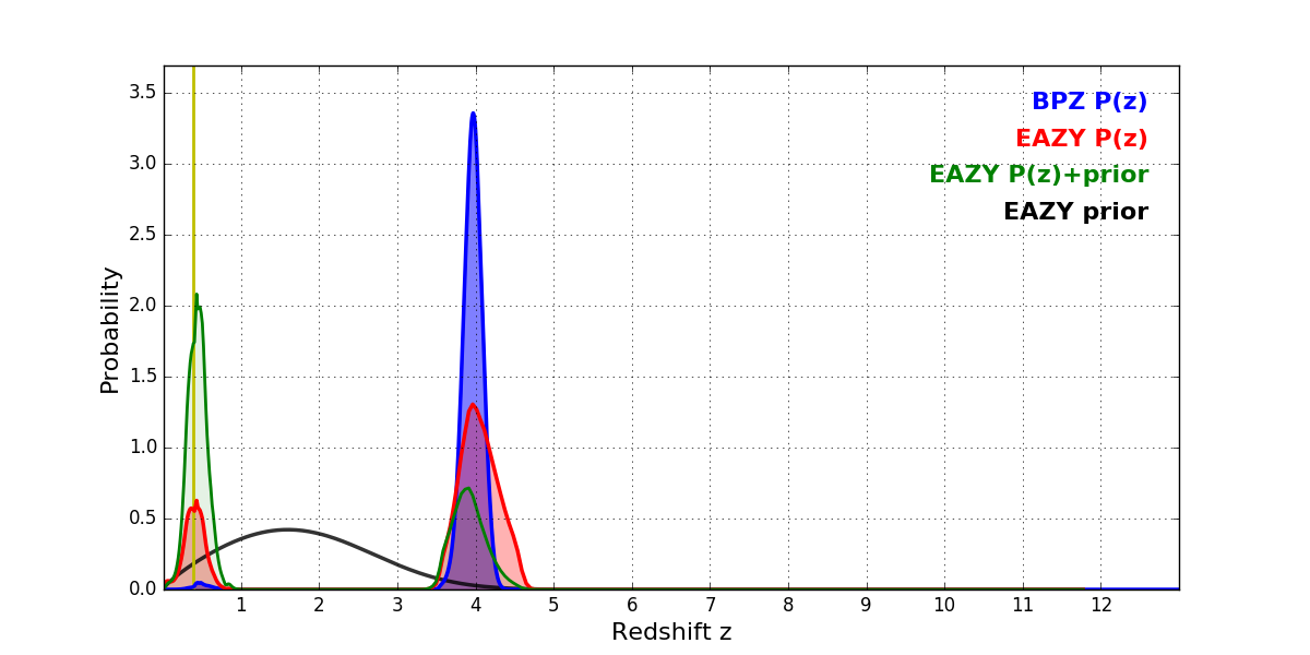 In P(z) plots: Yellow lines mark the cluster redshift z = 0.390,