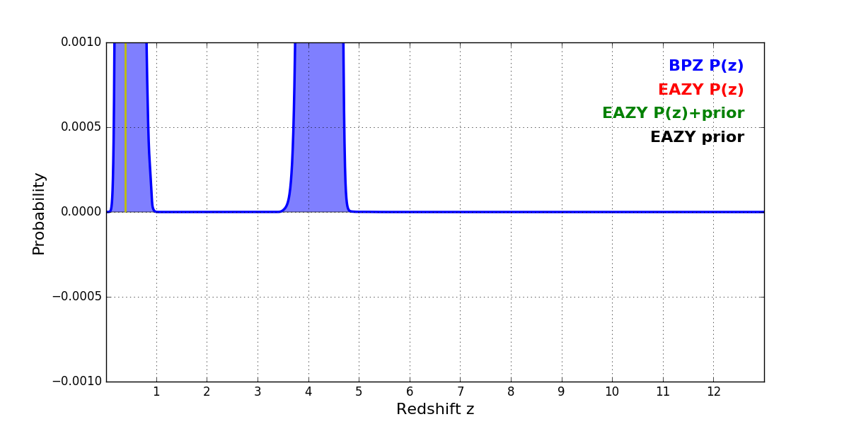 In P(z) plots: Yellow lines mark the cluster redshift z = 0.390,