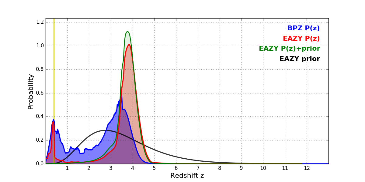In P(z) plots: Yellow lines mark the cluster redshift z = 0.390,