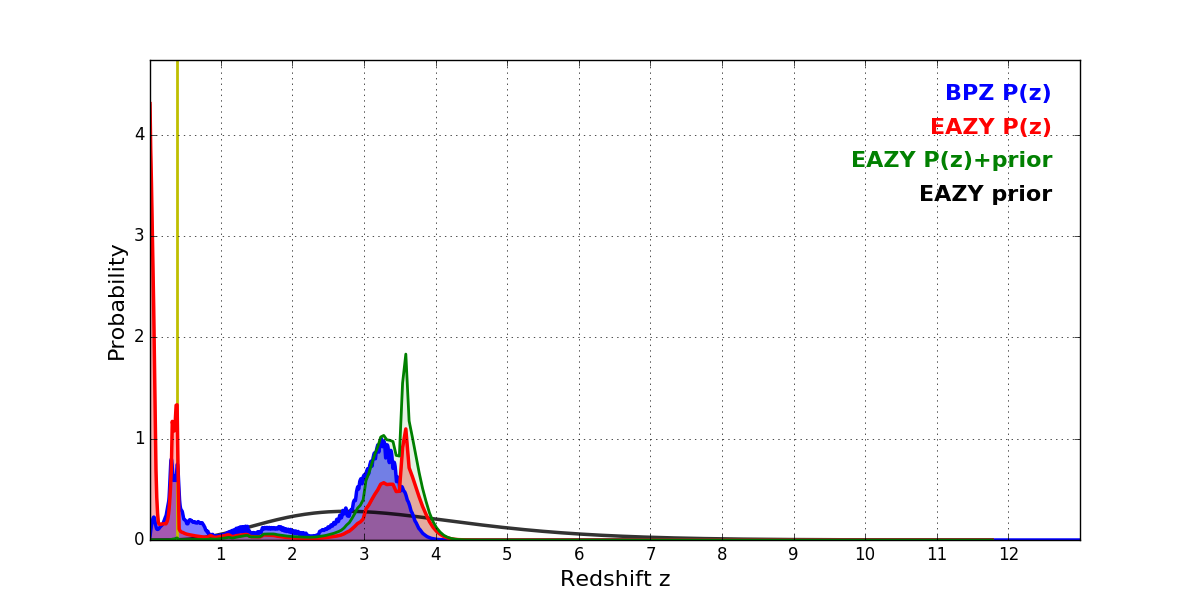 In P(z) plots: Yellow lines mark the cluster redshift z = 0.390,