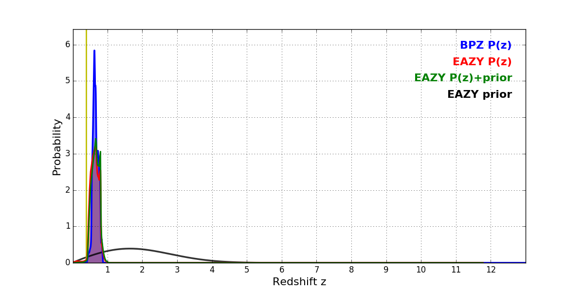 In P(z) plots: Yellow lines mark the cluster redshift z = 0.390,