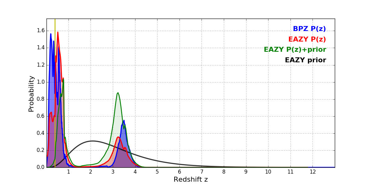In P(z) plots: Yellow lines mark the cluster redshift z = 0.390,