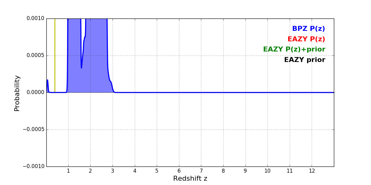 In P(z) plots: Yellow lines mark the cluster redshift z = 0.390,