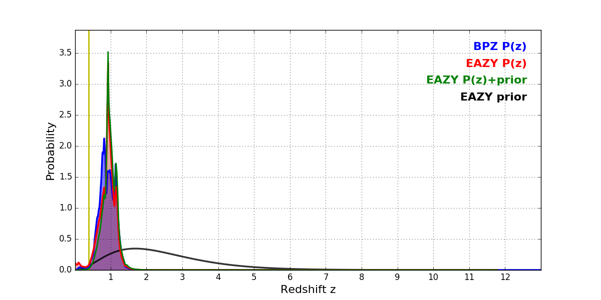 In P(z) plots: Yellow lines mark the cluster redshift z = 0.390,