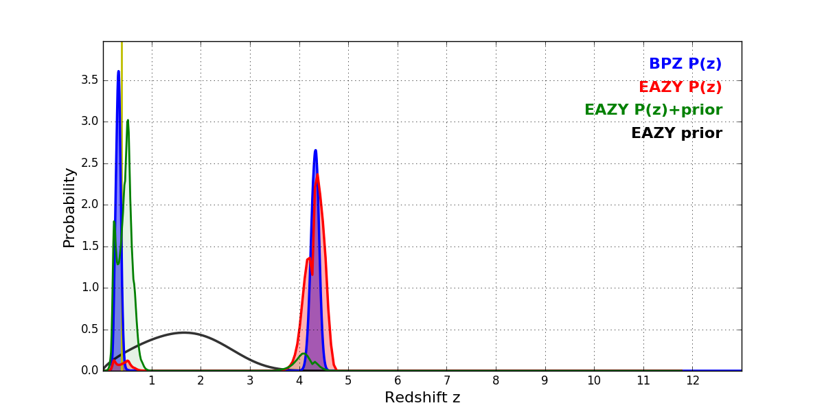 In P(z) plots: Yellow lines mark the cluster redshift z = 0.390,