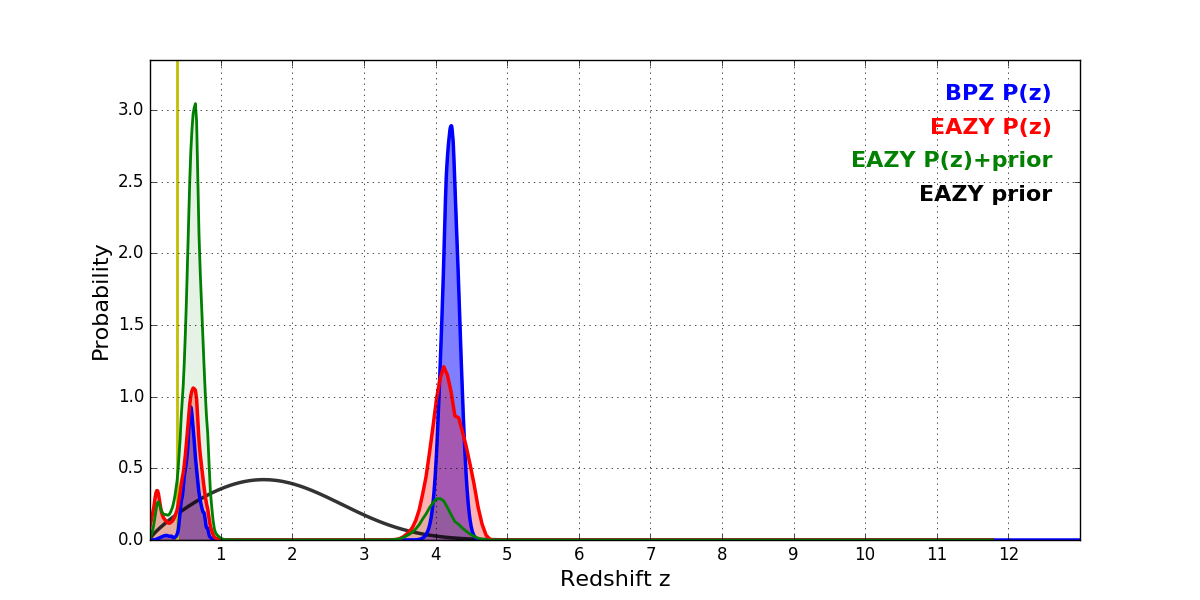 In P(z) plots: Yellow lines mark the cluster redshift z = 0.390,