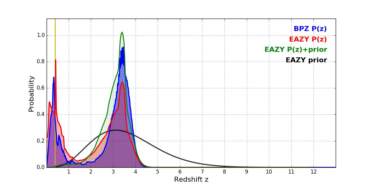 In P(z) plots: Yellow lines mark the cluster redshift z = 0.390,