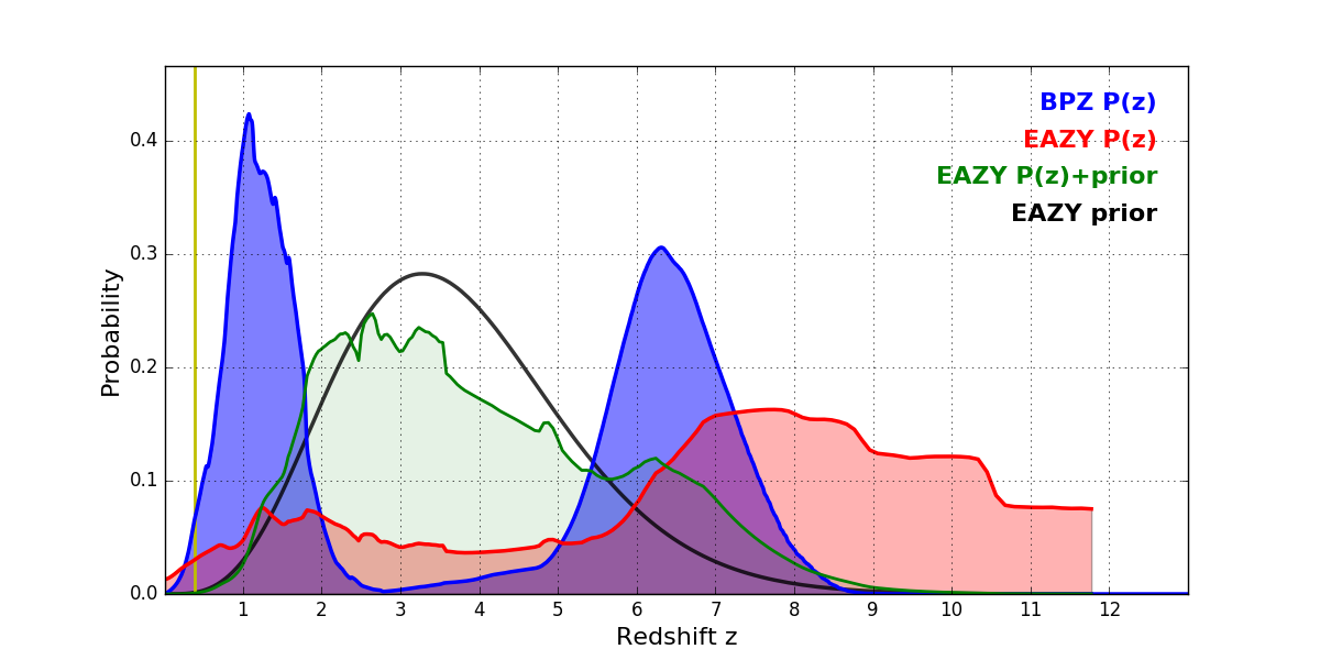 In P(z) plots: Yellow lines mark the cluster redshift z = 0.390,