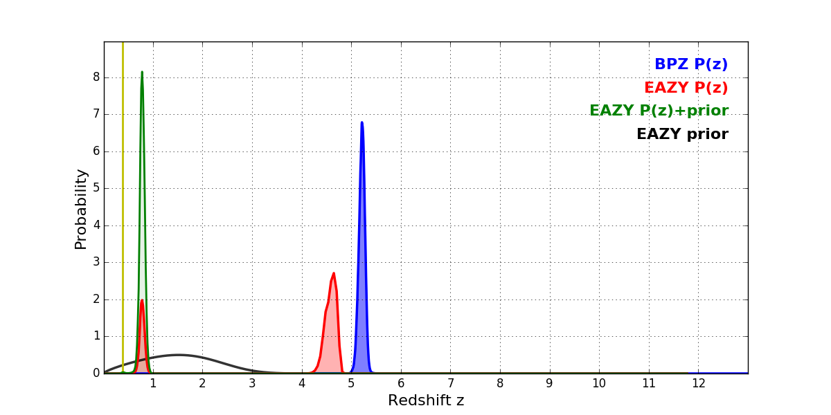 In P(z) plots: Yellow lines mark the cluster redshift z = 0.390,