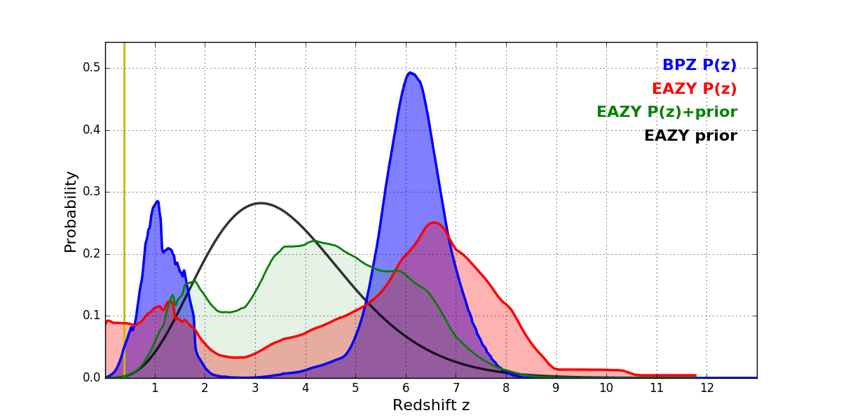 In P(z) plots: Yellow lines mark the cluster redshift z = 0.390,