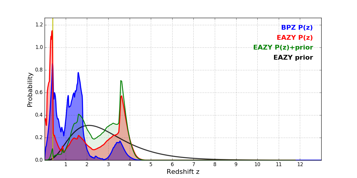 In P(z) plots: Yellow lines mark the cluster redshift z = 0.390,