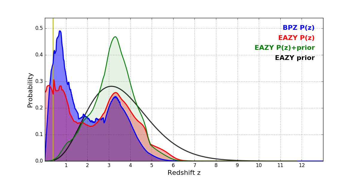 In P(z) plots: Yellow lines mark the cluster redshift z = 0.390,