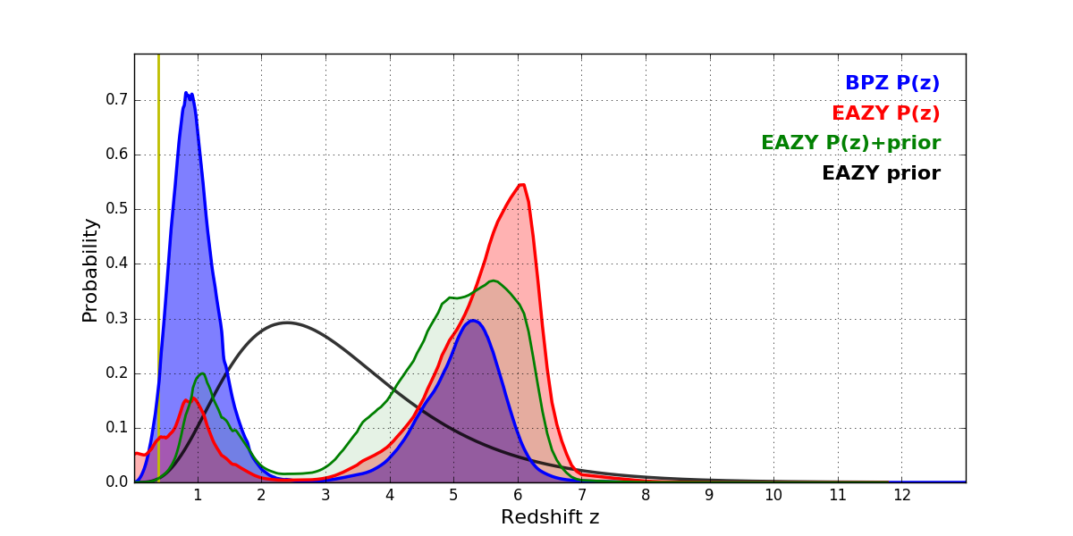 In P(z) plots: Yellow lines mark the cluster redshift z = 0.390,