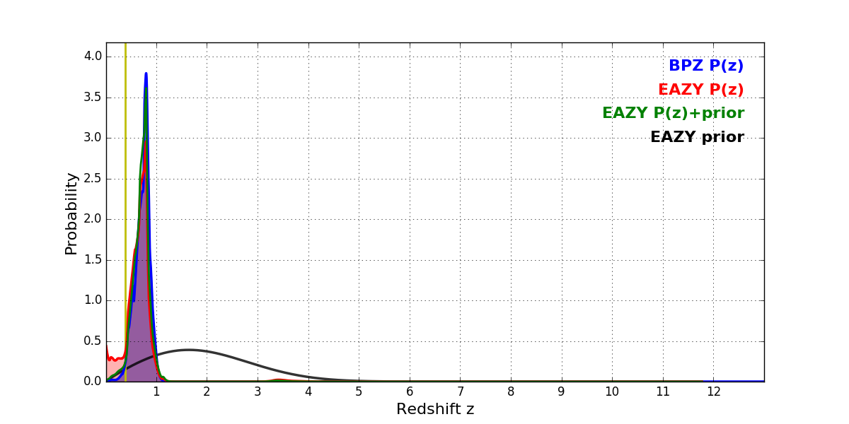 In P(z) plots: Yellow lines mark the cluster redshift z = 0.390,
