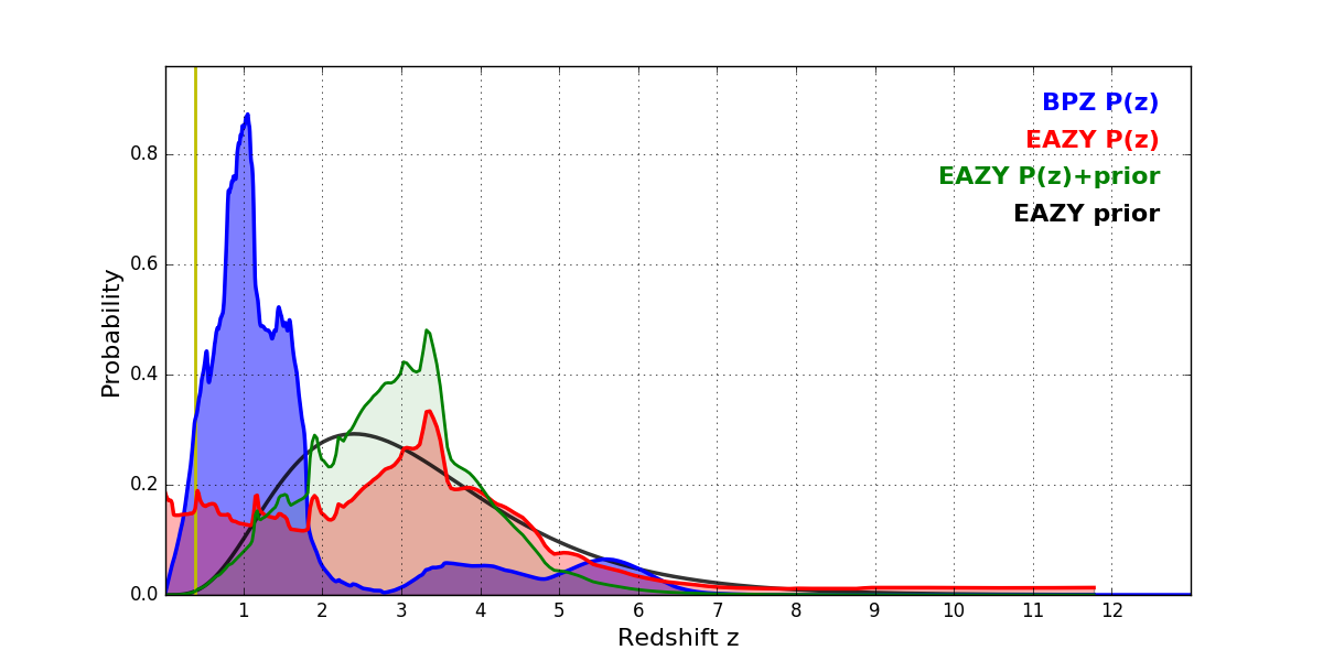 In P(z) plots: Yellow lines mark the cluster redshift z = 0.390,