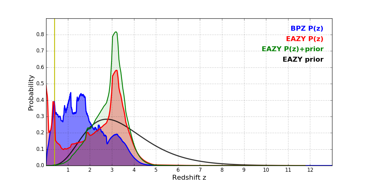 In P(z) plots: Yellow lines mark the cluster redshift z = 0.390,