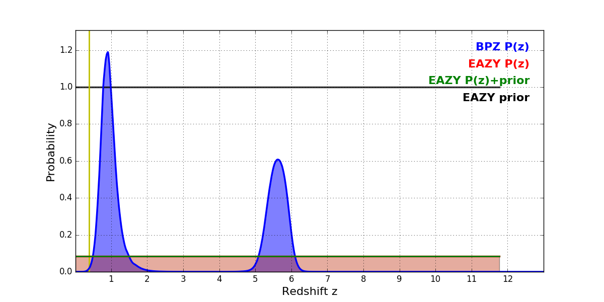 In P(z) plots: Yellow lines mark the cluster redshift z = 0.390,