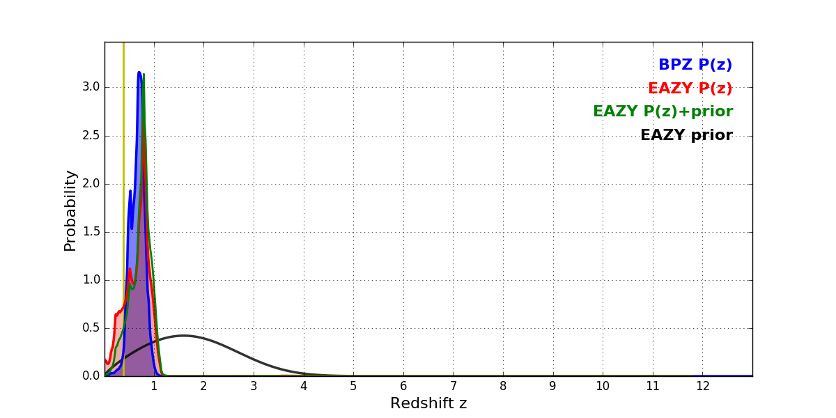 In P(z) plots: Yellow lines mark the cluster redshift z = 0.390,