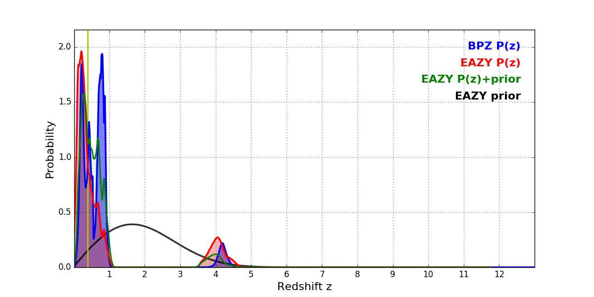 In P(z) plots: Yellow lines mark the cluster redshift z = 0.390,