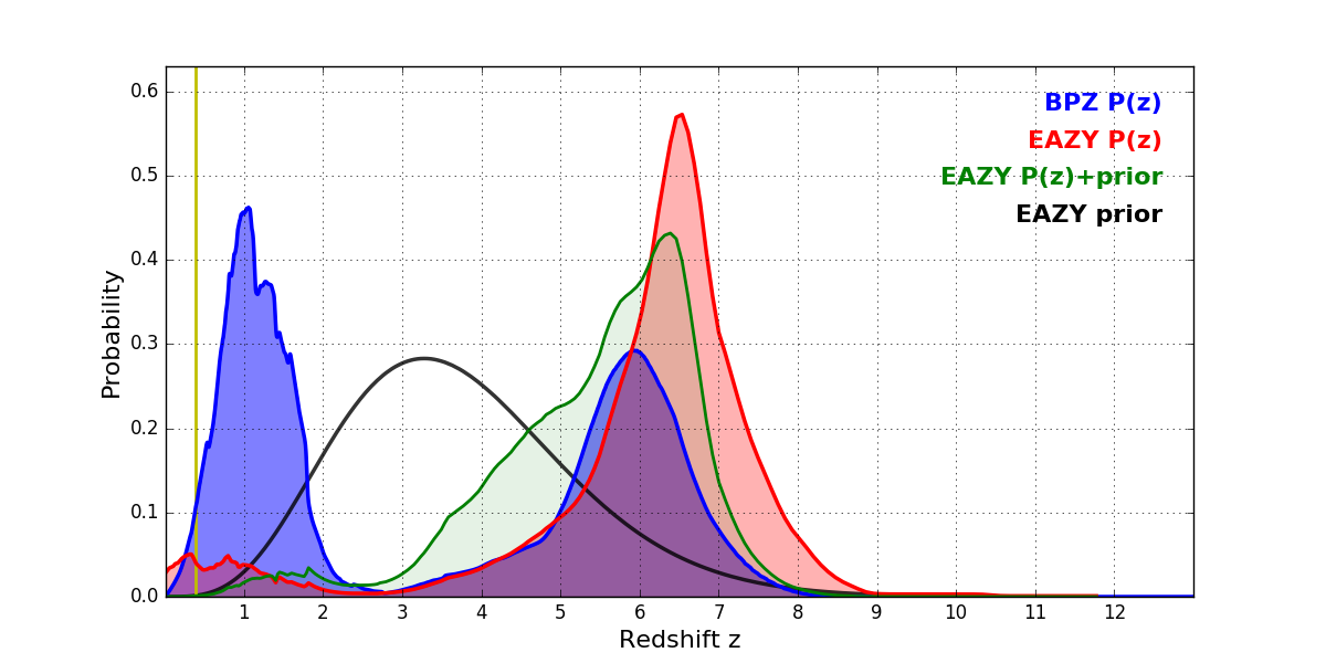 In P(z) plots: Yellow lines mark the cluster redshift z = 0.390,